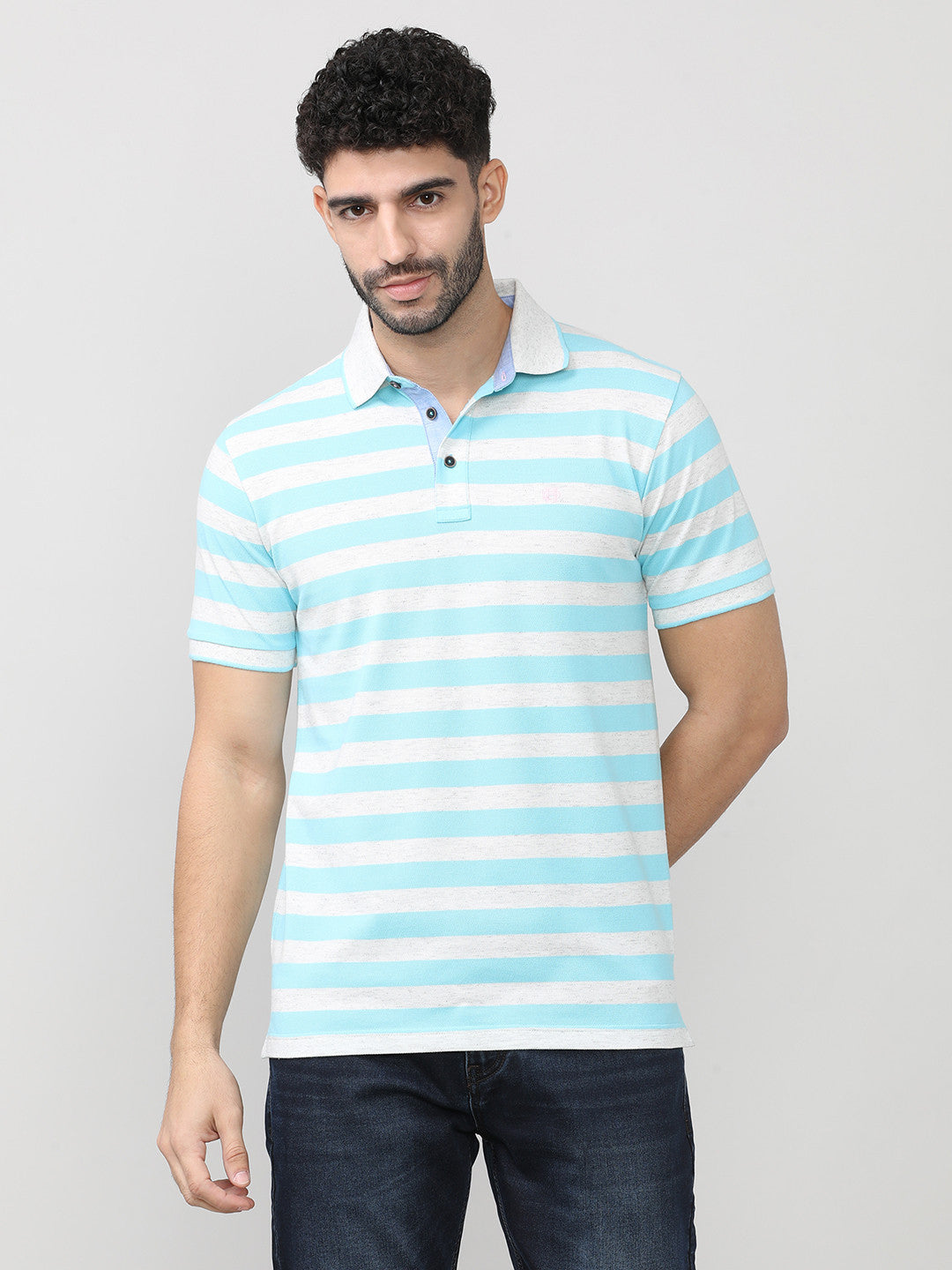 Crafted from a blend of high-quality pique lycra fabric, this t-shirt has a classy look and feel. Pair this classic aqua polo t-shirt with beige pants and white sneakers for a modern appeal. Designed in a contemporary slim fit, this t-shirt will certainly up your style game. - Pique Lycra...